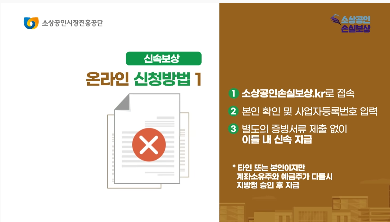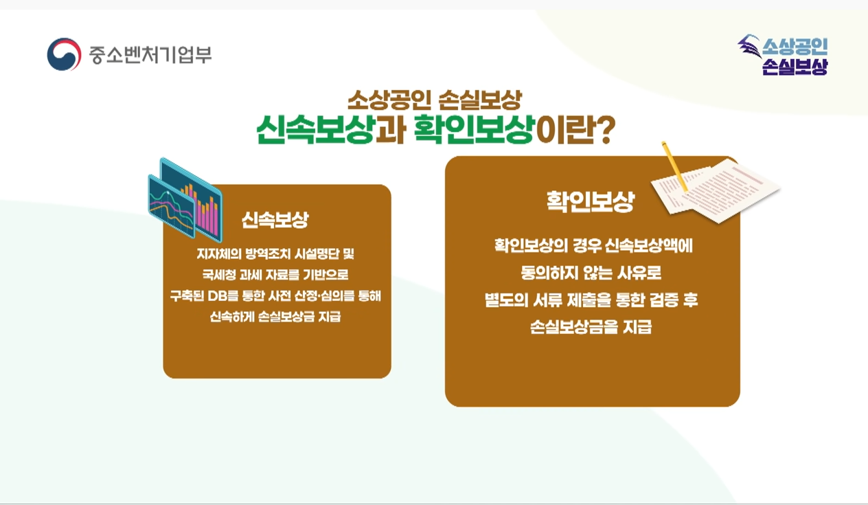 지금 손실보상은 신속 보상 시스템을 도입해 지원 대상자가 최대한 빠르고 간편하게 보상금을 신청하고 지급받을 수 있도록 할 계획이라고 합니다. 신속 보상을 신청하면 지자체 방역조치 시설 명단과 국세청 과세자료를 활용해 사전에 산정된 보상금을 지급받게 되는데요. 보상금이 미리 산정돼 있기 때문에 소상공인 손실보상 누리집에서 신청만 하면 서류 증빙을 따로 하지 않아도 되고 신청 후 이틀 내에 결졍되 보상금을 신속하게 지급받을 수 있다고 합니다. 만약 신속 보상에서 산정된 금액에 동의하지 않는 경우 확인 보상을 통해 증빙서류를 추가로 제출하여 보상금액을 다시 산정받을 수 있습니다. 확인 보상을 통해 산정된 금액에도 동의하지 않는 경우에는 이의신청을 통해 구제받을 수 있는 제도가 마련돼 있습니다.