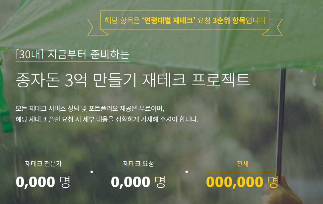 어 떤 재 테 크 가 필 요 하 세 요 ? "재테크어때"의 수 많은 재테크 전문가와 당신의 재테크를 똑똑하게 만들어 보세요! 재테크 가능항목 0123456789 0123456789 0123456789 여개 재테크 전문가 0123456789 , 01