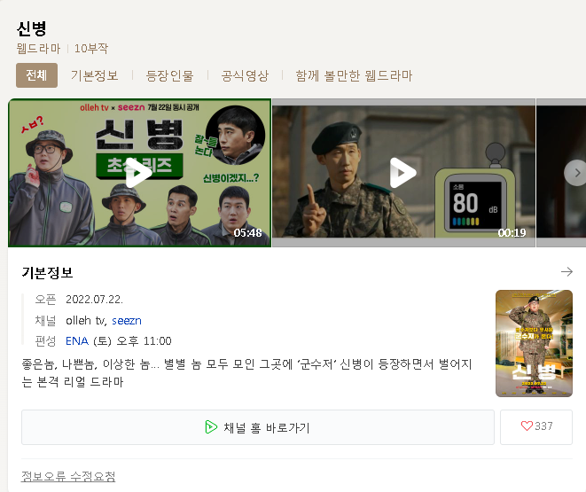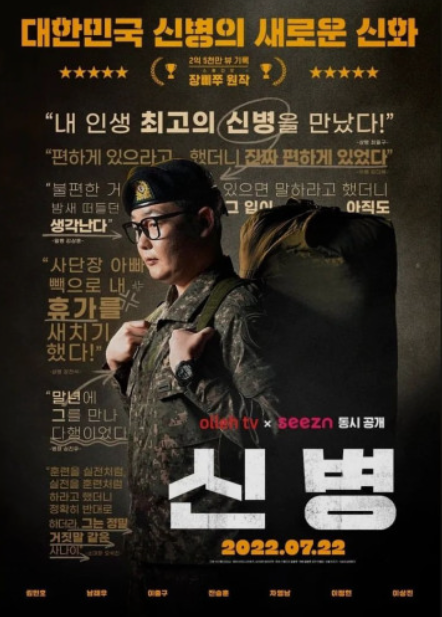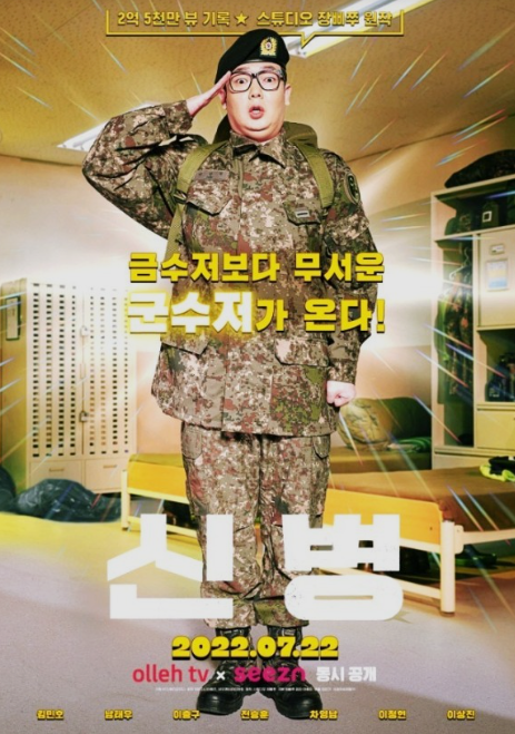 공개되는 '신병' 파트1은 총 10회 분량 중 1~5편으로 구성돼 '군 수위' 신병을 중심으로 한 다채로운 에피소드를 선보인다. '신병'은 총 10부작으로 올레 tv와 seezn에서 오늘 파트 1(1~5화)을 공개,대출 8월 5일 파트 2(6~10화)가 공개된다. ENA 채널에서는 오는 23일 첫 방송을 시작으로 매주 토요일 오후 11시에 방송된다.