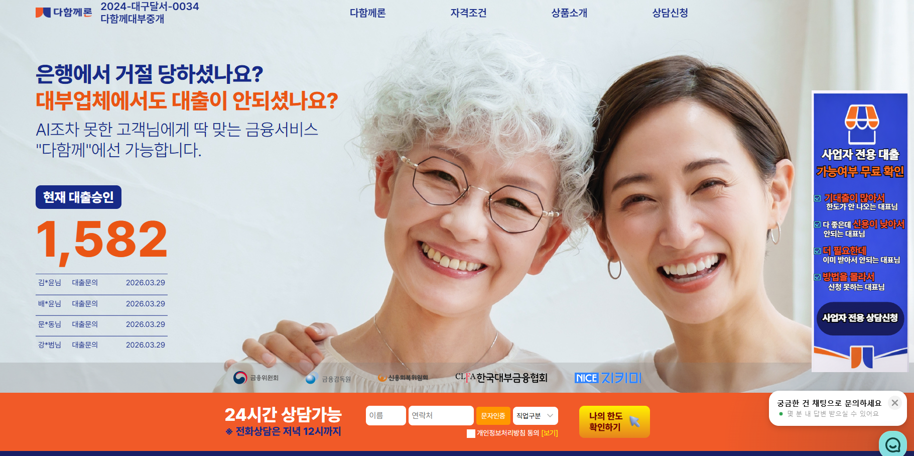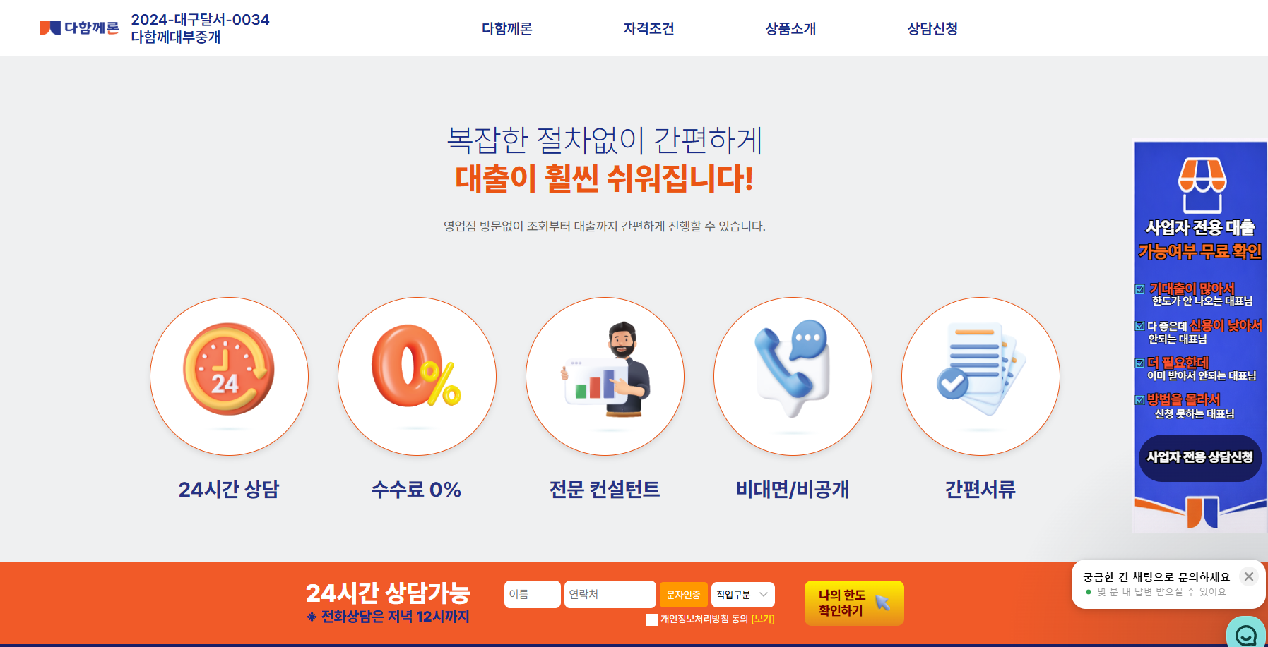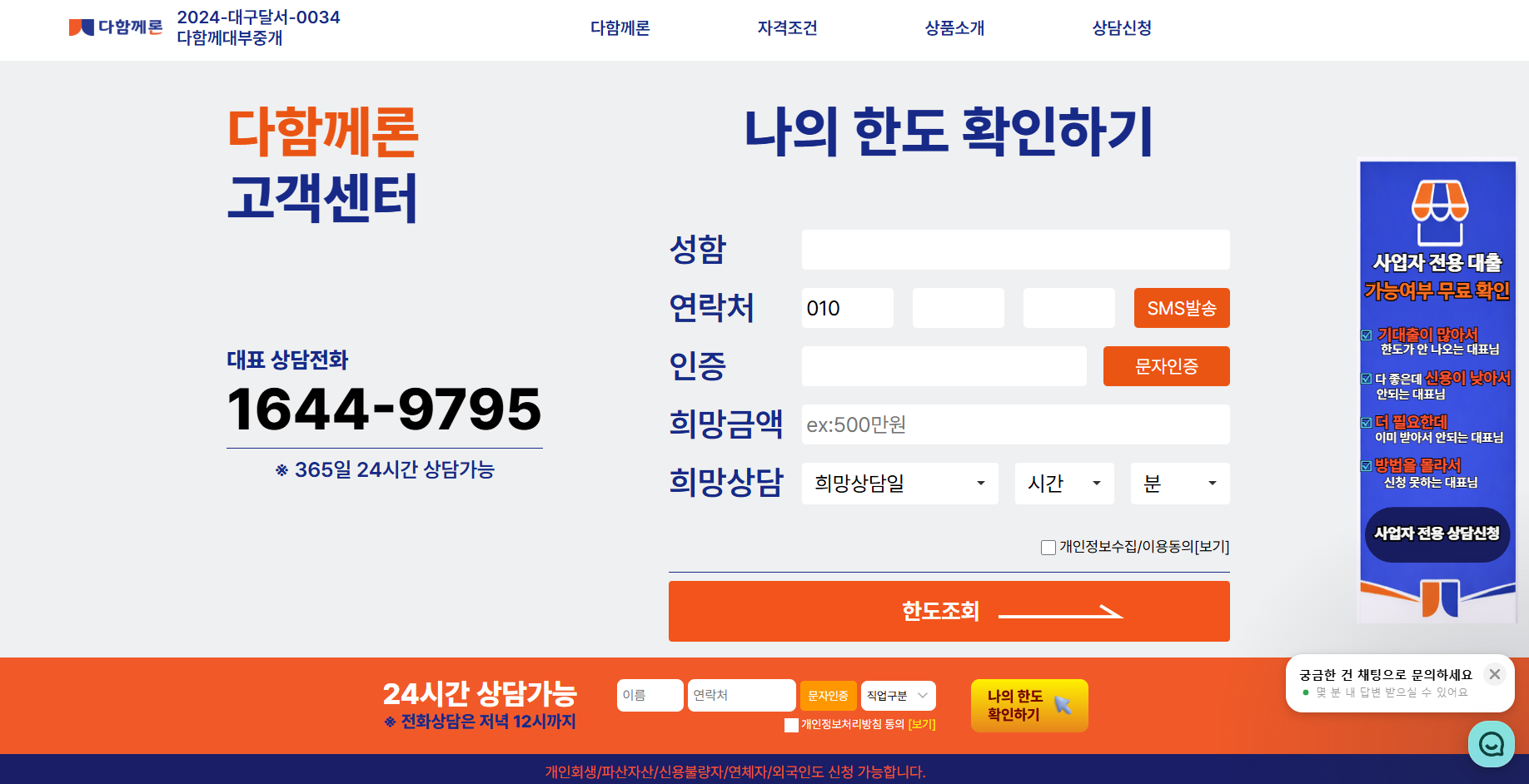 이러한 고민을 덜어드리기 위해 다함께론은 보다 간편하고 빠른 대출 서비스를 제공하고 있습니다. 특히 저신용자, 직장인, 자영업자, 프리랜서, 주부, 무직자까지 폭넓게 상담이 가능하여, 다양한 상황에 맞는 맞춤형 금융 솔루션을 안내해 드립니다. 이제는 여러 금융사를 일일이 방문하거나 복잡한 서류를 준비할 필요 없이 조회 한 번으로 간편하게 대출 가능 여부를 확인할 수 있습니다. 시간과 노력을 아끼면서도 본인에게 적합한 조건을 찾을 수 있는 것이 가장 큰 장점입니다.